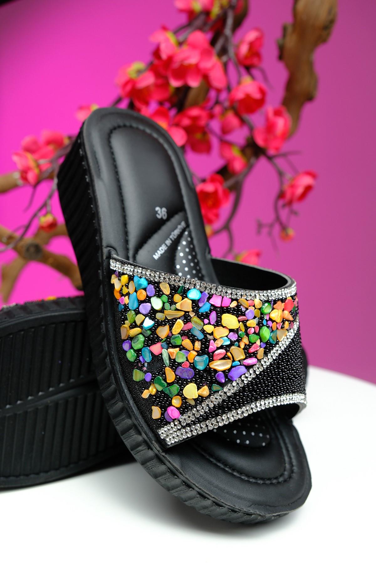 Dazzi Ortopedik Hafif Taban Topuklu Taş ve Boncuk Detaylı Günlük Kadın Terlik