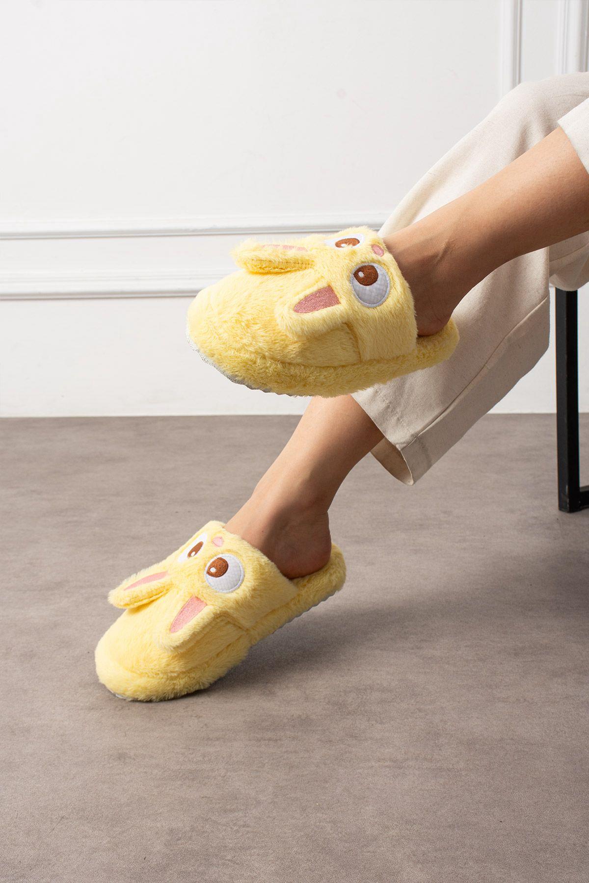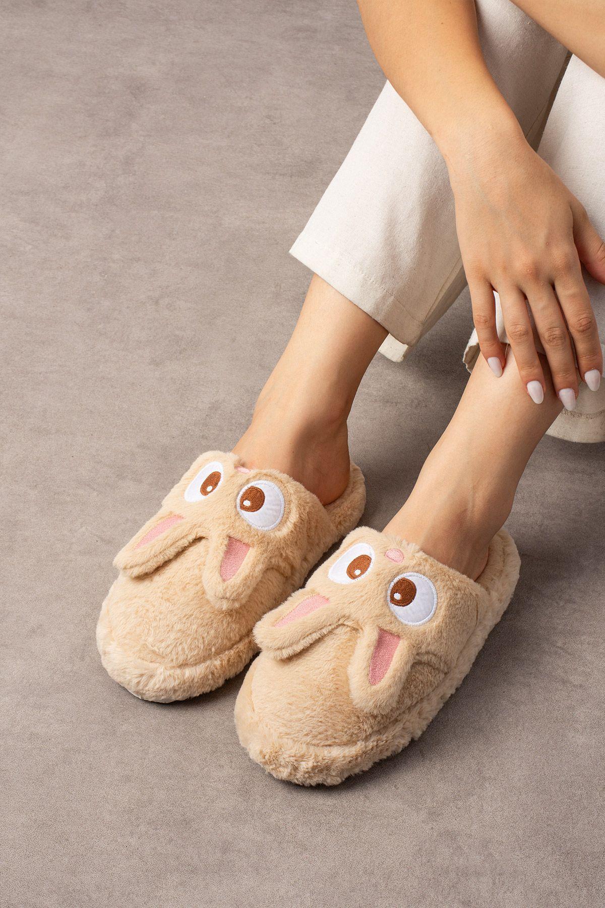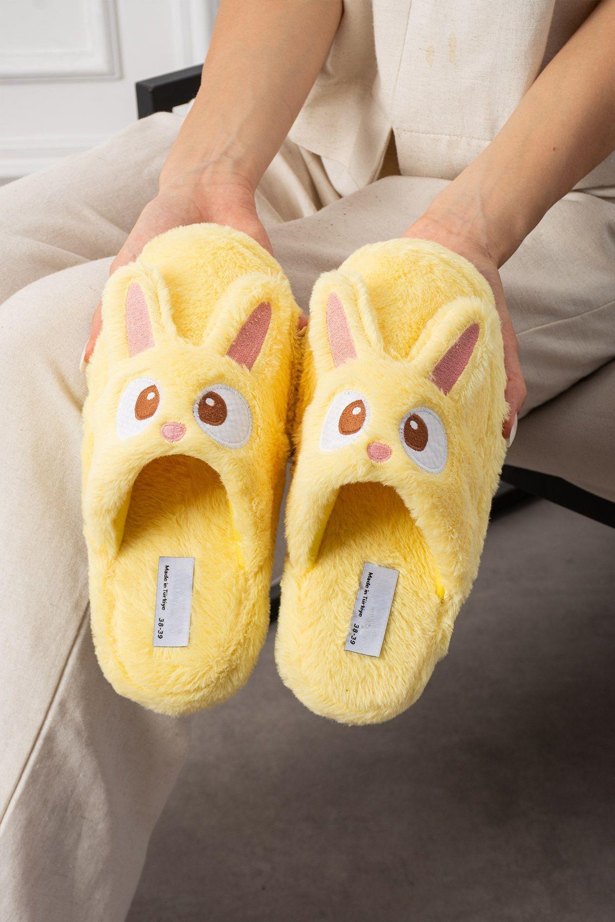 My Tavşan Nakışlı Kadın Ev Terliği Peluş Terlik Çeyiz ve Bohça Terliği Ses Yapmaz Kalın Taban