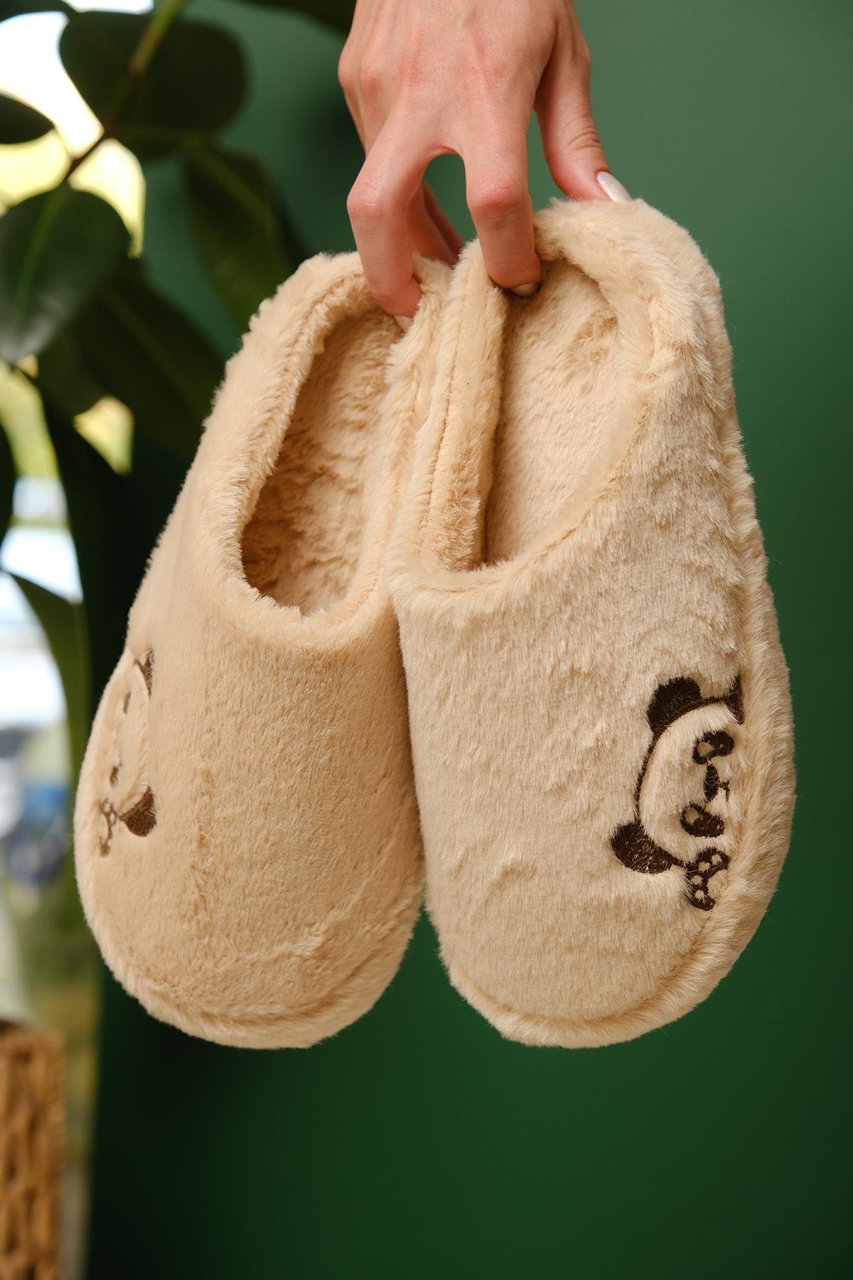 Panda Nakışlı Kadın Ev Terliği Peluş Terlik Çeyiz ve Bohça Terliği Ses Yapmaz Kalın Taban